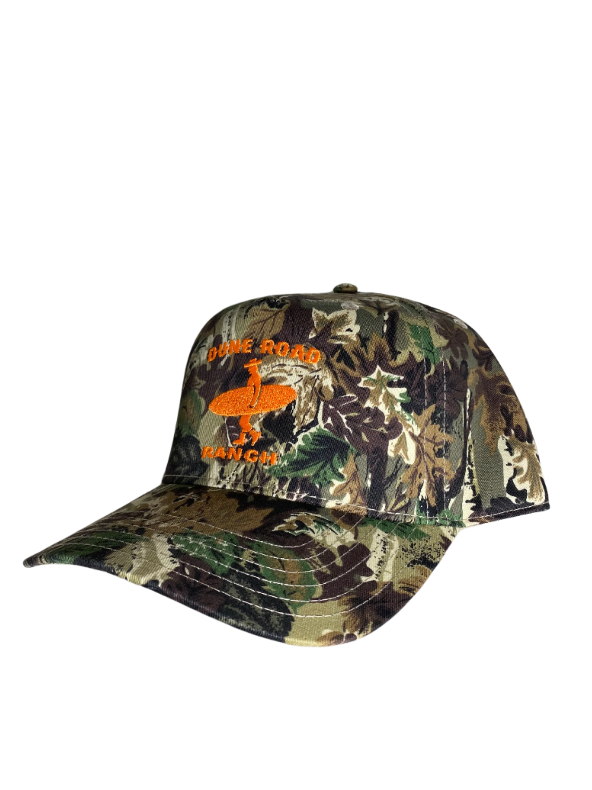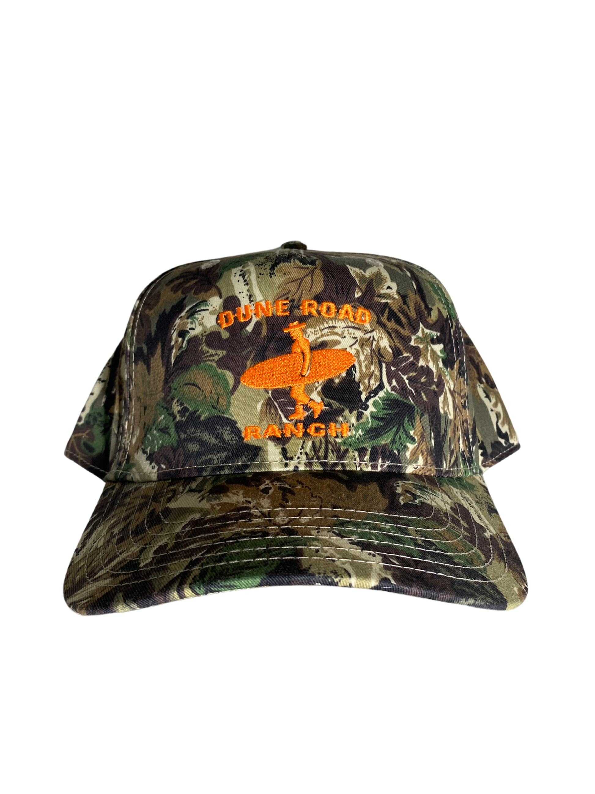 Our signature hat is a classic 5-panel structured cap made with a premium cotton-poly blend and is locally designed and produced here on Long Island. This Camo and Orange colorway offers a versatile style with clean and classy structured lines and features our embroidered Dune Road Ranch logo consisting of a surfing cowboy silhouette and our signature font. With an adjustable snapback strap, one size fits most.