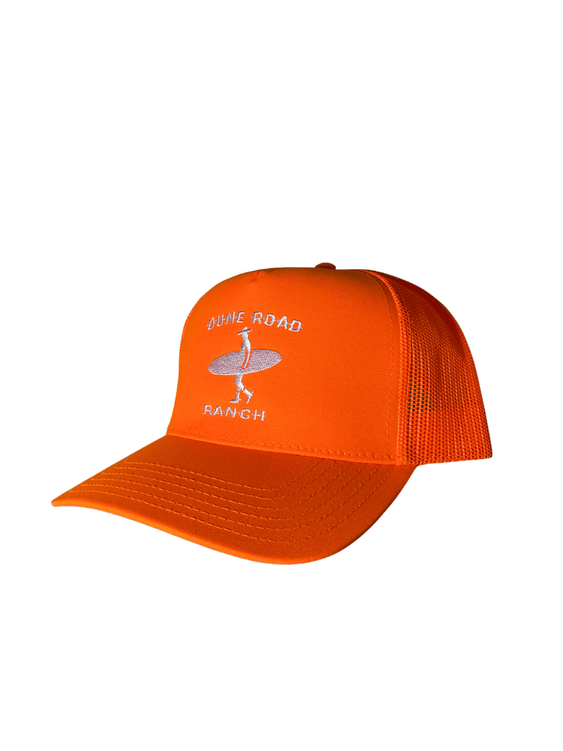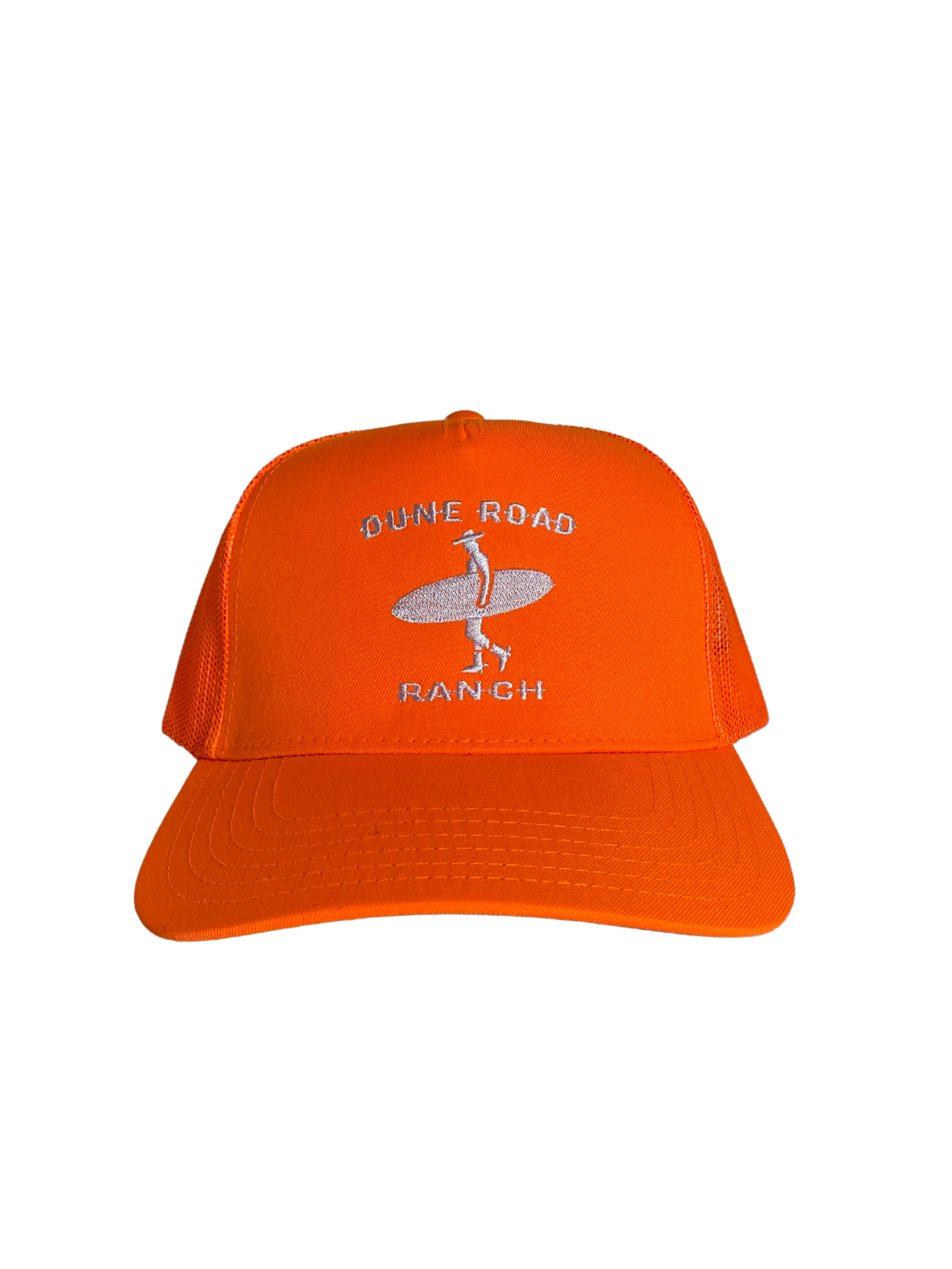 Our trucker hat is a classic 5-panel structured cap made with a premium polyester blend and NOT cheap foam, and is locally designed and produced here on Long Island. This Neon Orange and White colorway with a Light Gray undervisor offers a fun and vibrant style with clean structured lines and features our embroidered Dune Road Ranch logo consisting of a surfing cowboy silhouette and our signature font. With an adjustable snapback strap, one size fits most.