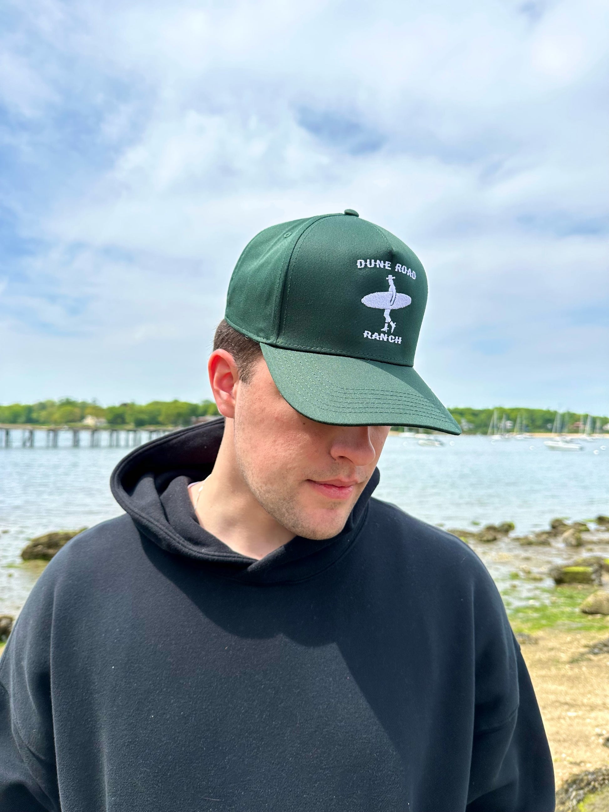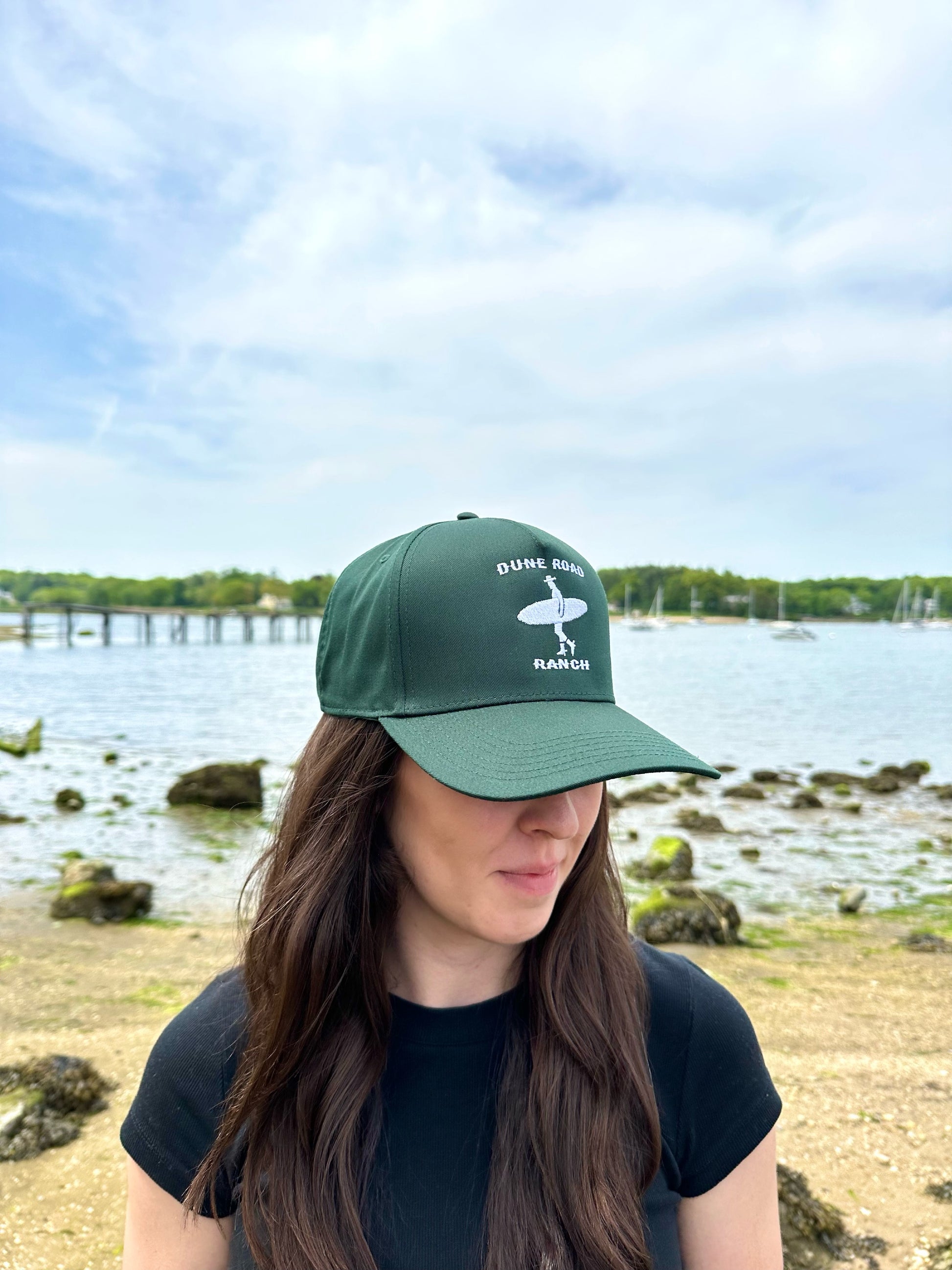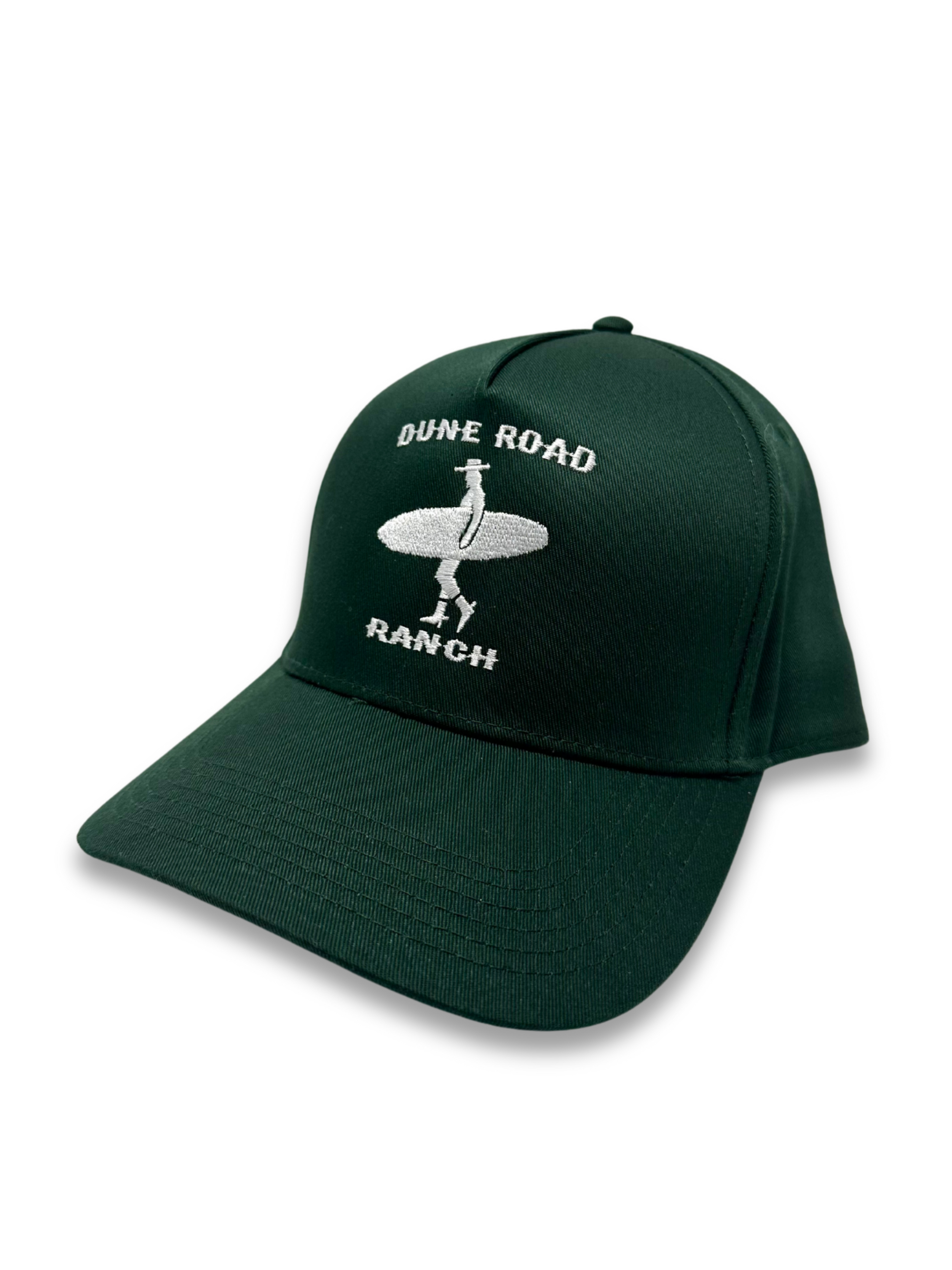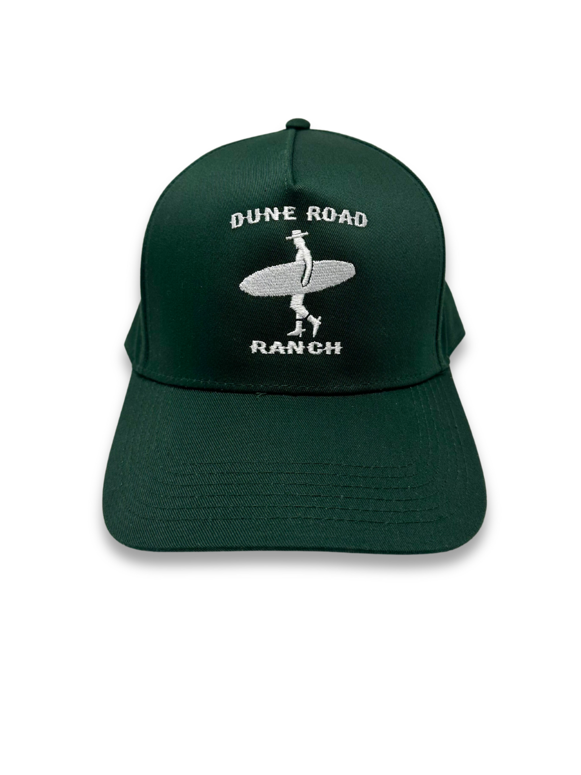 Our signature hat is a classic 5-panel structured cap made with a premium cotton-poly blend and is locally designed and produced here on Long Island. This Dark Green and White colorway offers a versatile style with clean and classy structured lines and features our embroidered Dune Road Ranch logo consisting of a surfing cowboy silhouette and our signature font. With an adjustable snapback strap, one size fits most.