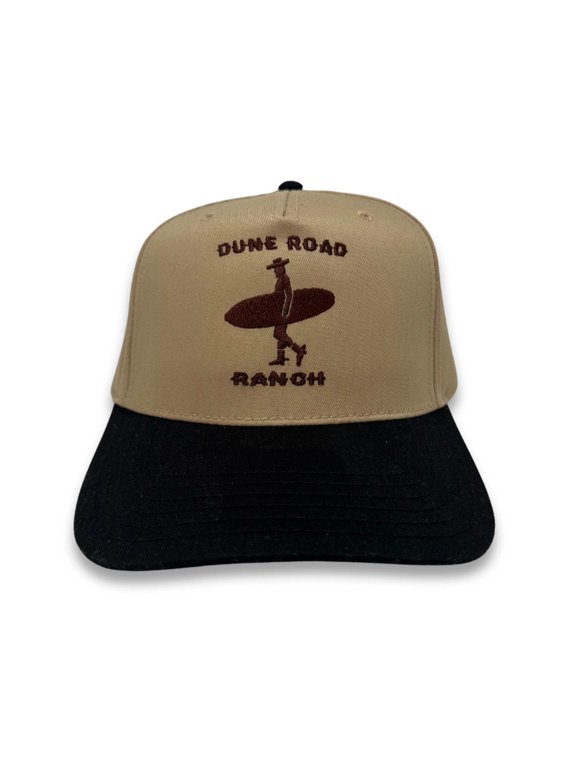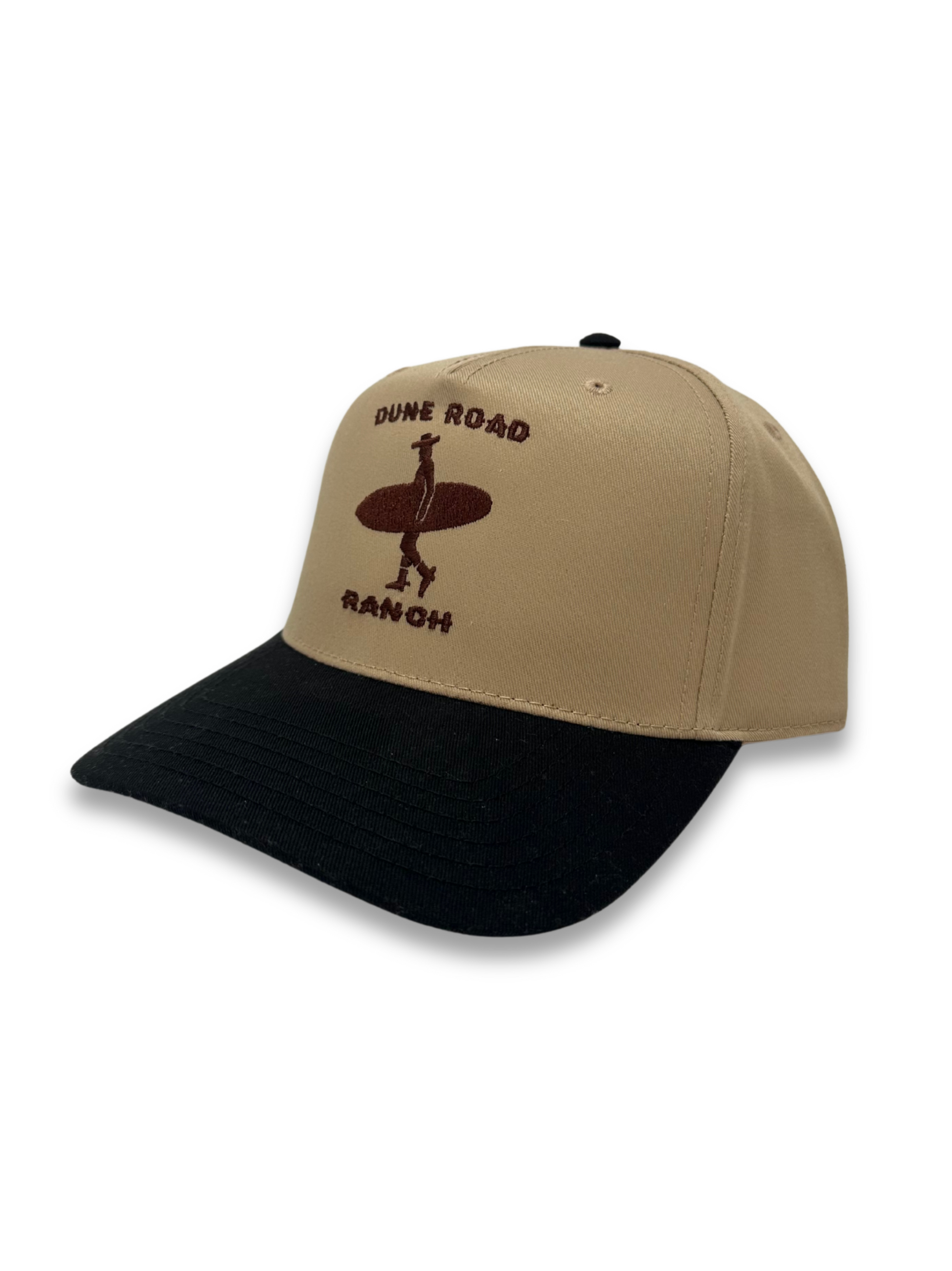 Our signature hat is a classic 5-panel structured cap made with a premium cotton-poly blend and is locally designed and produced here on Long Island. This Khaki, Black, and Dark Brown colorway offers a versatile style with clean and classy structured lines and features our embroidered Dune Road Ranch logo consisting of a surfing cowboy silhouette and our signature font. With an adjustable snapback strap, one size fits most.