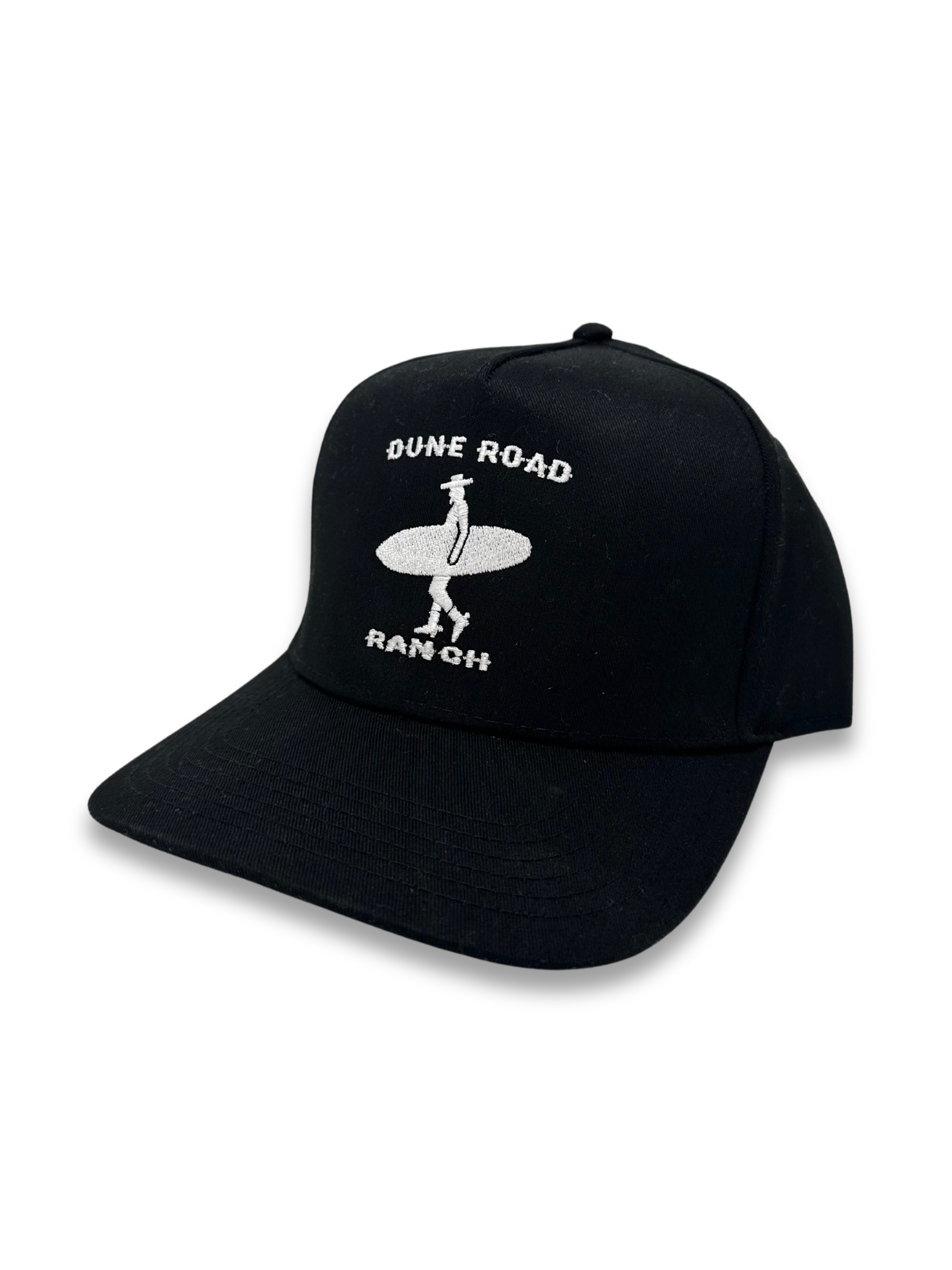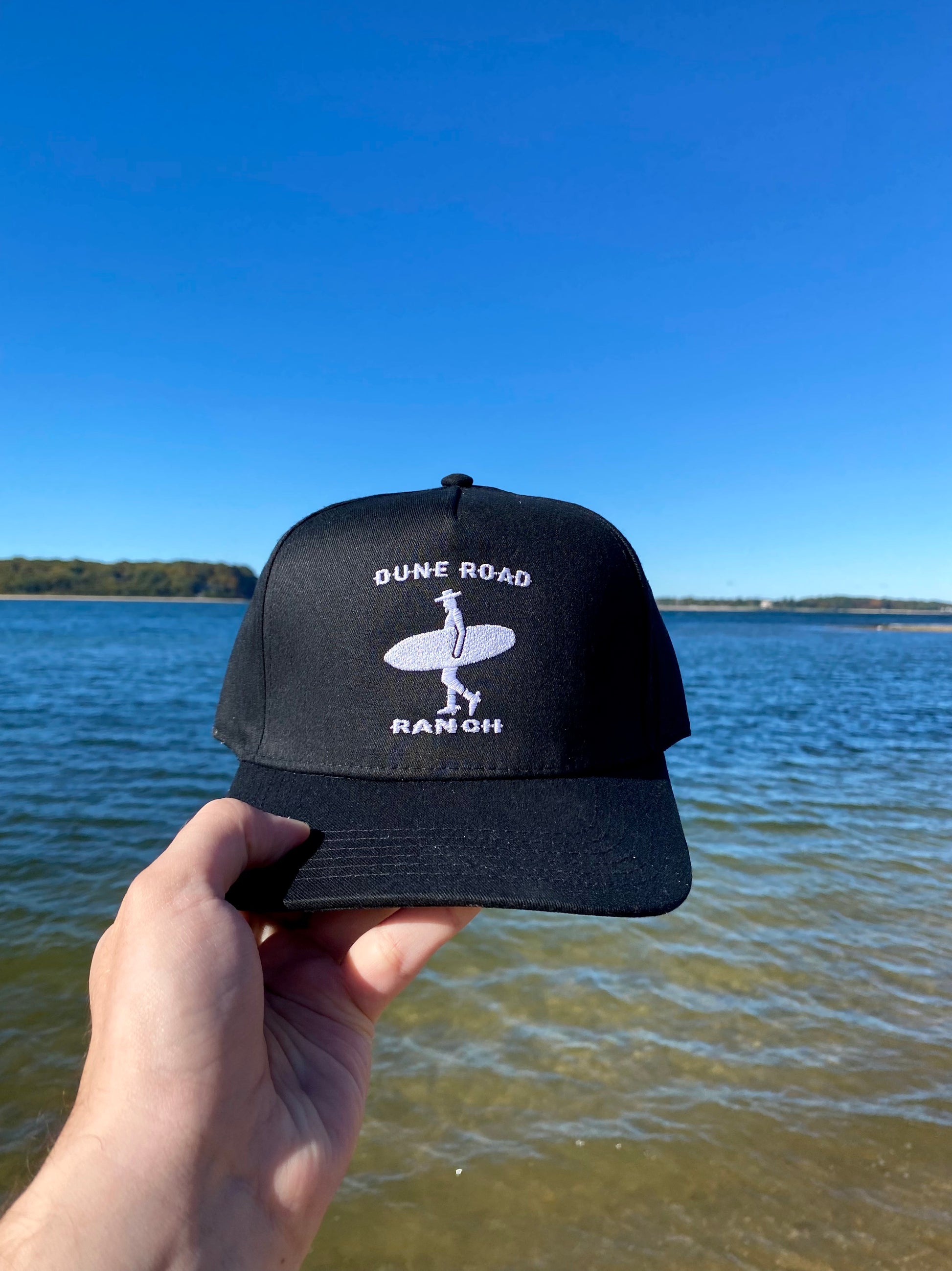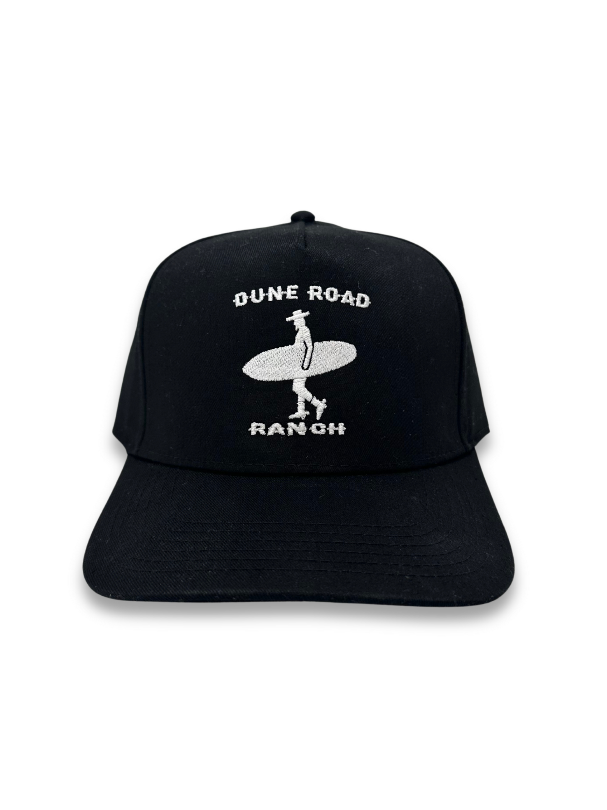 Our signature hat is a classic 5-panel structured cap made with a premium cotton-poly blend and is locally designed and produced here on Long Island. This Black and White colorway offers a versatile style with clean and classy structured lines and features our embroidered Dune Road Ranch logo consisting of a surfing cowboy silhouette and our signature font. With an adjustable snapback strap, one size fits most.