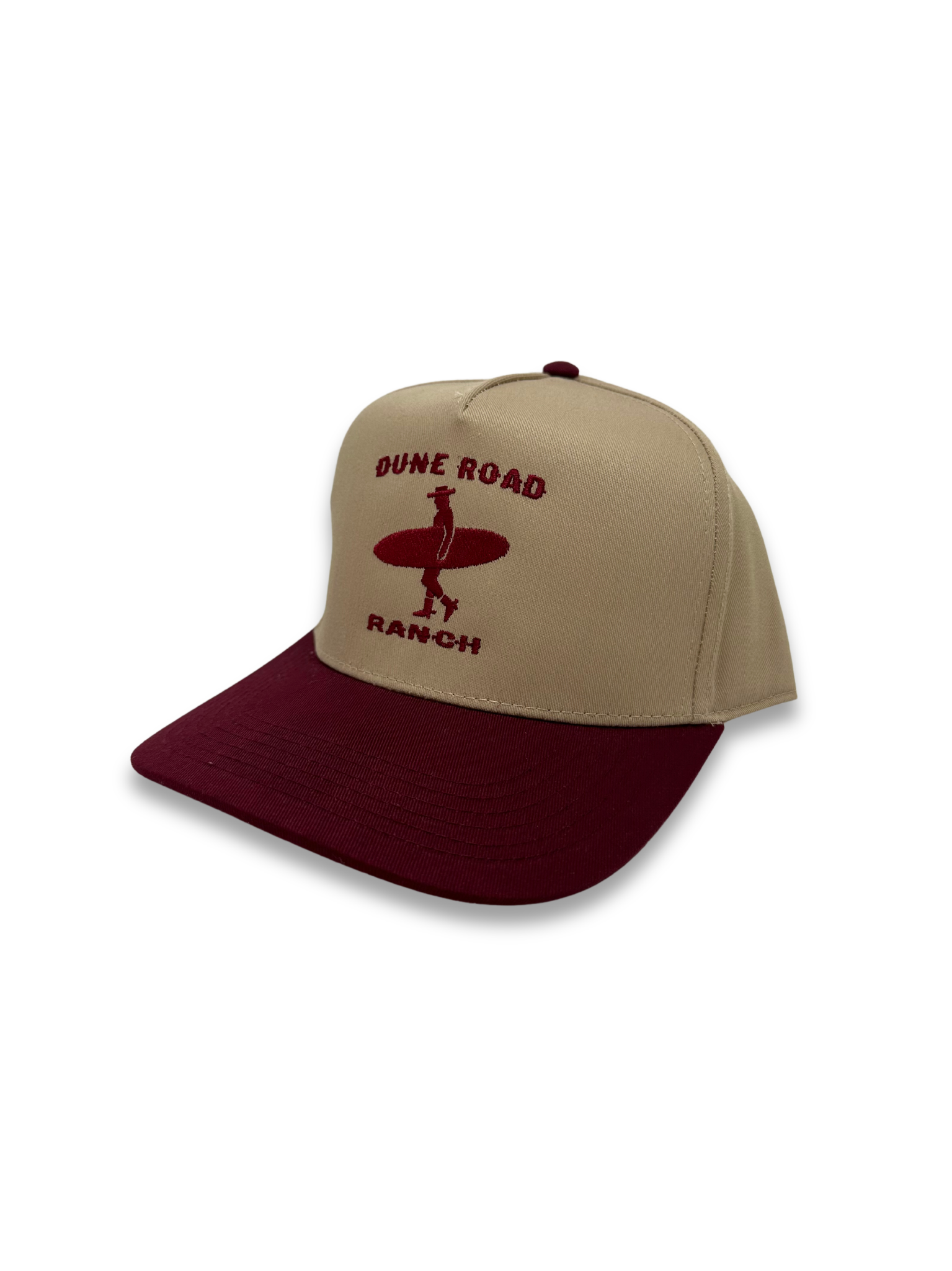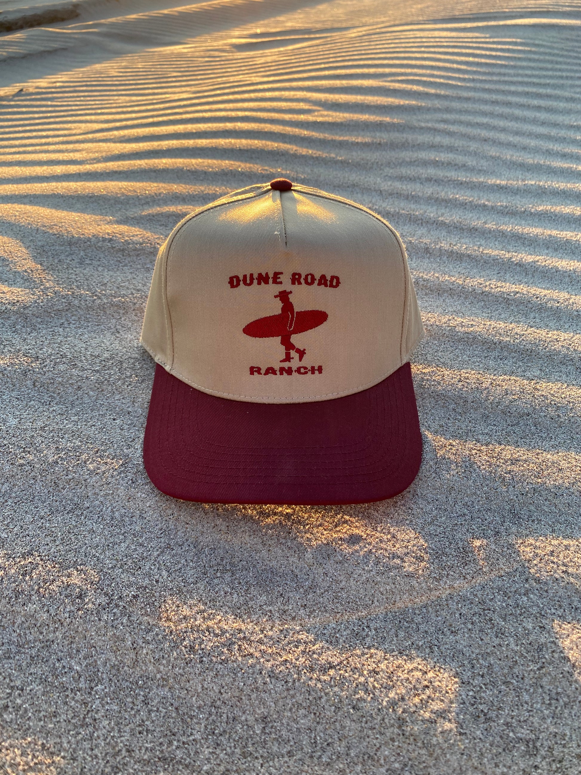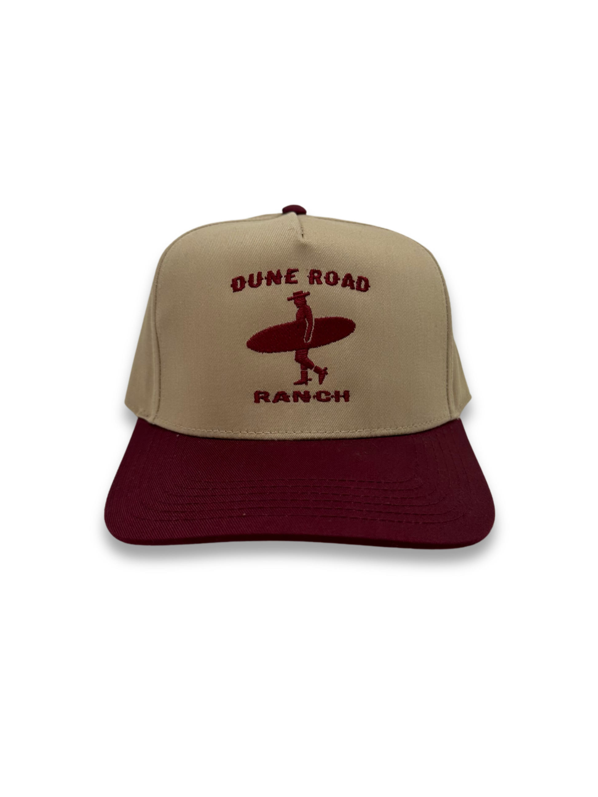 Our signature hat is a classic 5-panel structured cap made with a premium cotton-poly blend and is locally designed and produced here on Long Island. This Khaki and Maroon colorway offers a versatile style with clean and classy structured lines and features our embroidered Dune Road Ranch logo consisting of a surfing cowboy silhouette and our signature font. With an adjustable snapback strap, one size fits most.