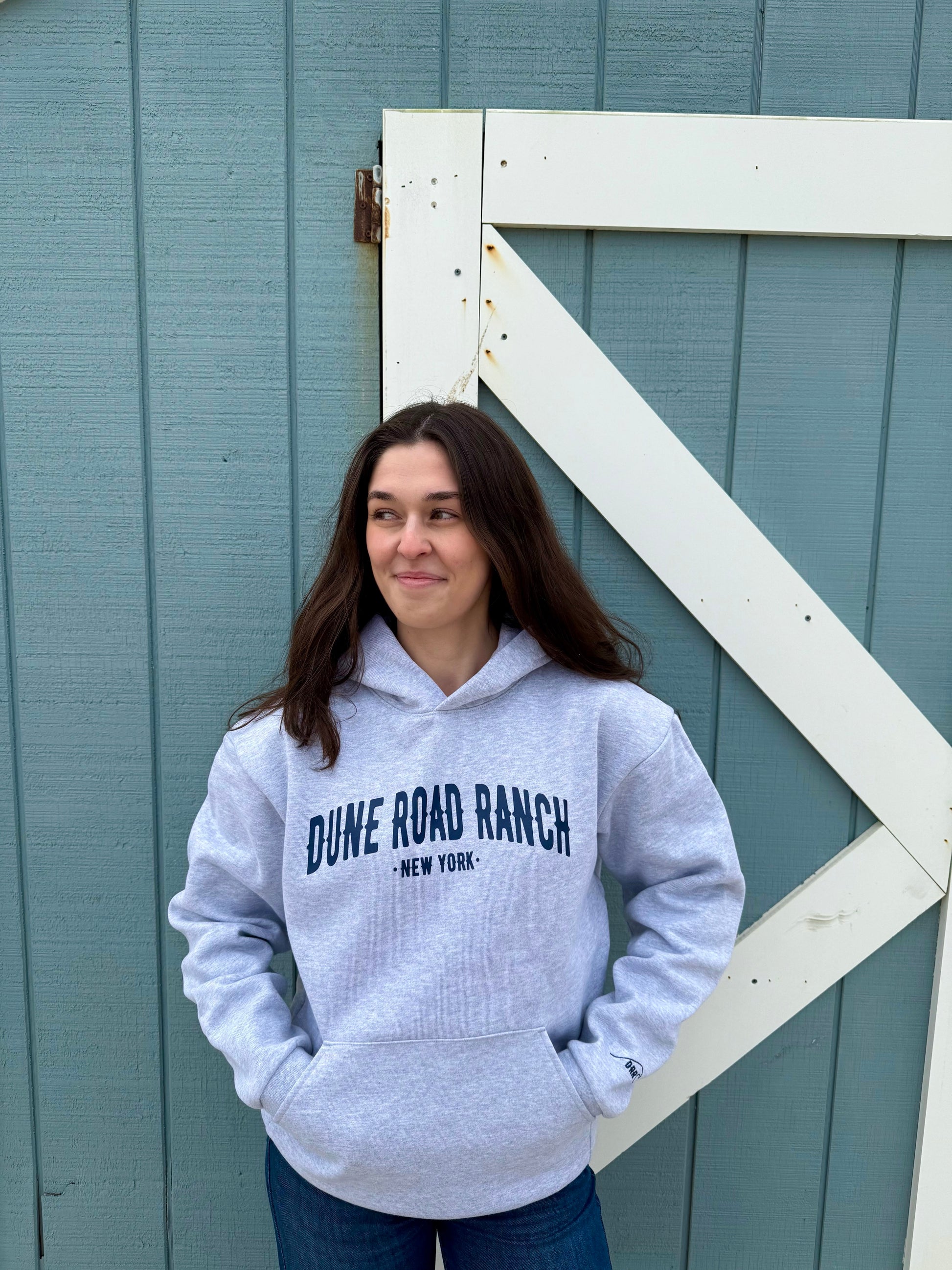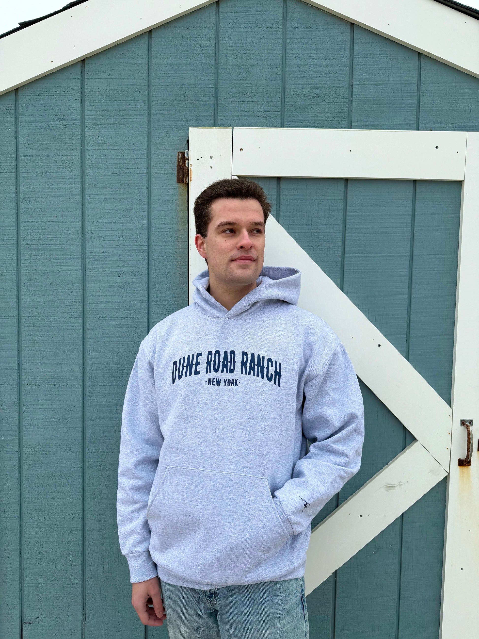 This premium heavyweight hoodie features our Dune Road Ranch Varsity logo printed across the chest in Navy and our DRR Wave logo embroidered in Navy on the left sleeve. With an oversized fit and unisex sizing, this hoodie will definitely be your new favorite. Locally designed and produced on Long Island, we recommend machine wash cold and hang dry for best care.
